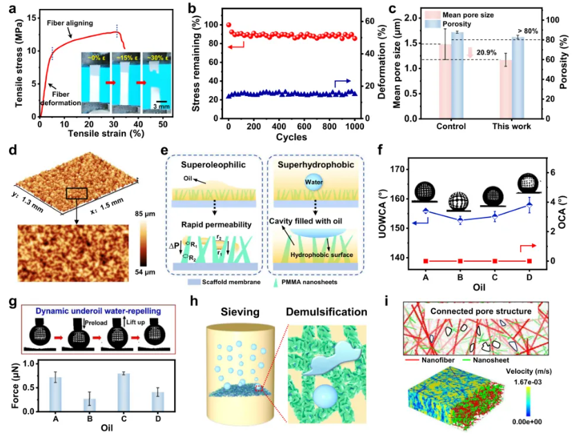 该纳米片/纳米纤维膜展现出优异的机械性能,拉伸强度达12.9 MPa,且在1000次循环拉伸后仍保持85%以上的最大应力(图3a,b)。纳米片的引入使平均孔径降低20.9%,同时孔隙率维持在80%以上(图3c),表面粗糙度约为4.9 μm(图3d)。膜表面具有超亲油与油下超疏水特性(图3e),在各种油类中均表现出低水黏附力(<1 μN)(图3f,g)。其分离机制结合了孔道筛分与结构破乳作用,并通过三维模型验证了连通孔道对液体快速传输的促进作用(图3h,i)。