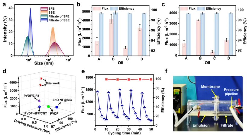 在功能性测试中,该膜对无表面活性剂乳液(SFE)和表面活性剂稳定乳液(SSE)均展现出卓越的分离能力(图4a–c)。对不同油类乳液的分离通量最高达4179 L/m²/h,且效率始终高于99%。与文献报道的其他材料相比,该膜在效率与通量之间实现了良好平衡(图4d)。循环使用测试显示,膜经乙醇清洗后通量可恢复,分离效率未明显下降(图4e),显示出优异的抗污染性能与长期使用潜力。基于此,研究团队还构建了连续分离装置,为大规模乳液处理提供了可行方案(图4f)。