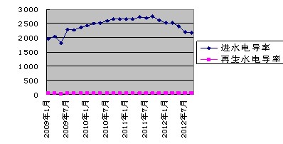 本项目自2009年投入运行,目前已运行三年多时间,所产生的再生水水质稳定可靠,超滤膜及RO膜均没有进行更换,系统工作情况良好。超滤的化学清洗周期约为20 ~ 28 d,RO的化学清洗周期约为30 ~ 40 d。
