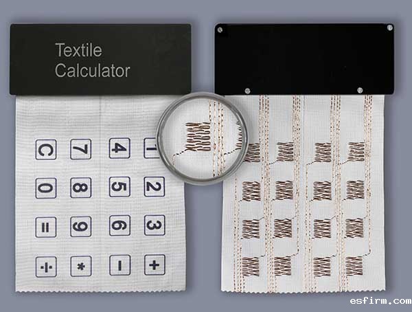 The concept of a ‘textile calculator’ was developed by Jakob Müller Group, in cooperation with the textile research institute Thuringen-Vogtland. Müller’s patented MDW? multi-directional weaving technology is able to create the meander fields which allow calculator functions to be accessed at a touch. A novel and useful facility, which suggests limitless expansion.