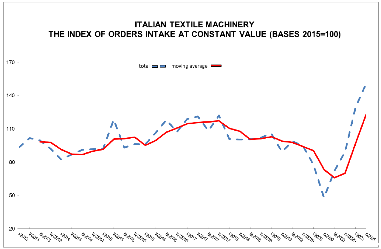 The index of orders intake for Italian textile machinery, as processed by ACIMIT, the Association of Italian textile machinery manufacturers, for the period ranging from April-June 2021, was up 214% compared to the same 2020 period. The value of the index was attested at 150.7 points (basis: 2015 = 100), a result that was no doubt influenced by the comparison with a quarter, from April-June 2020, in which orders were obviously at a minimum, due to the Covid-19 pandemic.