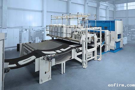 Another strong pillar of our sales program over decades has been fibre preparation and high speed webforming equipment for other nonwoven technologies. During these years, there has been a shift to higher throughput rates, and in some cases in Asia, a requirement for improved MD/CD strength ratios of hydroentangled products. In addition, our further development of the high-speed layering principle “Hyperlayer” made considerable progress for better CD strength through a combination of inline cards and crossline card with crosslapper. Particularly, carding machines in a working width above 3.5 m up to 5.1 m have been supplied by DiloSpinnbau as complete high speed carding systems, comprising two or even three cards in a line to directly feed the hydroentangling units of various suppliers. Together with DiloTemafa not only have high throughput rates been achieved in the fibre preparation section of the line but also dedusting filtering and air-conditioning systems have been successfully engineered and integrated.