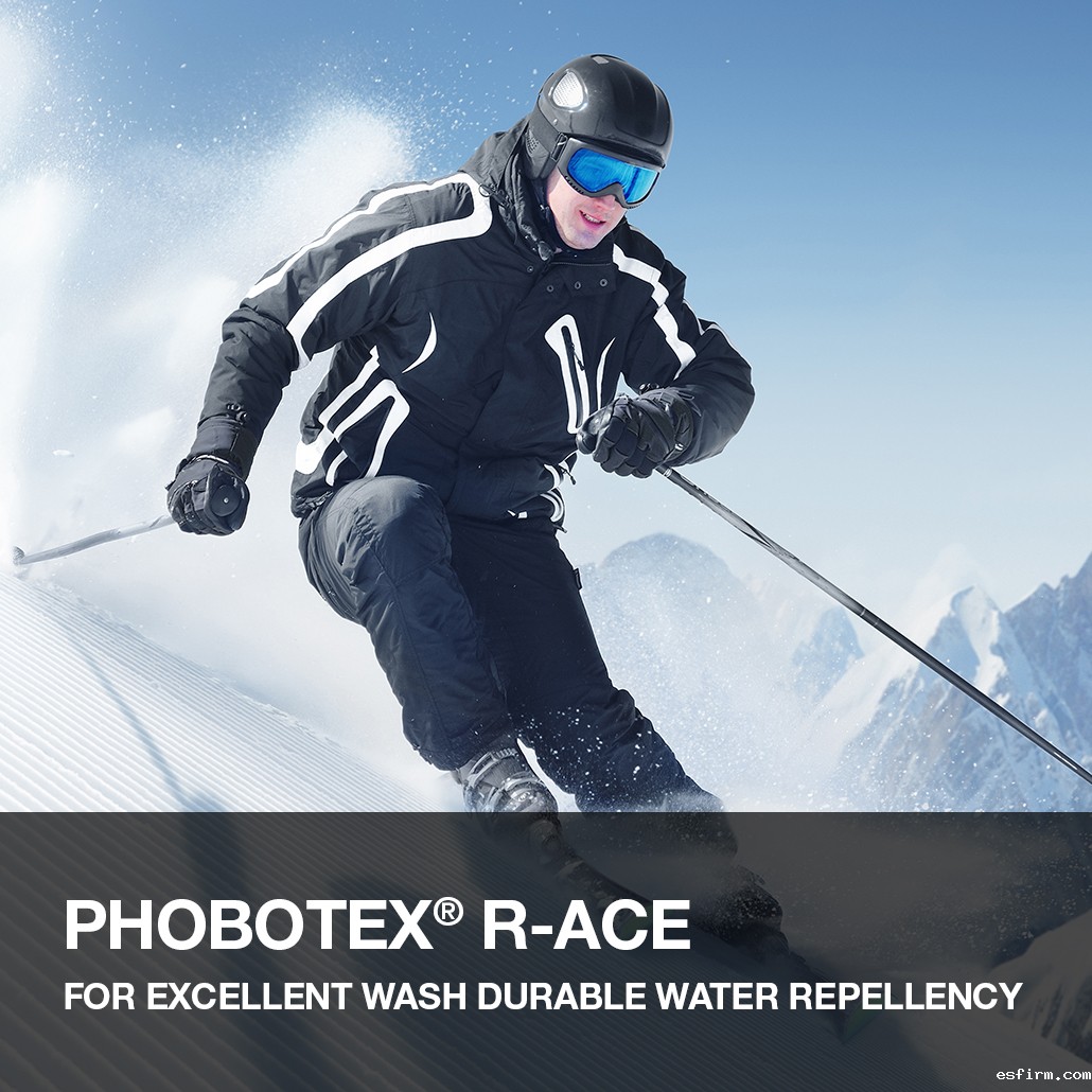 PHOBOTEX® R-ACE delivers excellent water repellence on all types of fibers. In addition to its outstanding performance on synthetic fibers and blends, PHOBOTEX® R-ACE offers excellent compatibility with resin finishing to ensure even application with unmatchable performance on cellulosic fibers. It offers outstanding rain and splash protection for garments that are water repellent and windproof, even under the toughest conditions. Additionally, it repels everyday stains, such as mud, coffee, ketchup and juice, so that garments stay cleaner for longer. Textiles treated with PHOBOTEX® R-ACE are breathable, retain their soft handle and continue to look good and perform well through repeated laundering and drying.
