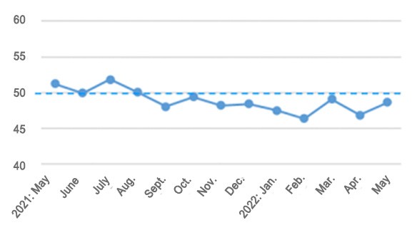 In May, the raw material purchasing index came in at 51.39, up 2.62 over April; the raw material inventory index came in at 48.46, up 0.45 month-on-month; the production index was 49.47, increasing 2.33 from April; the product sales index came in at 48.11, up 1.95 from April; the product inventory index was 47.73, growing 0.61 from April and the business index came in at 47.82, up 2.08 from the previous month.