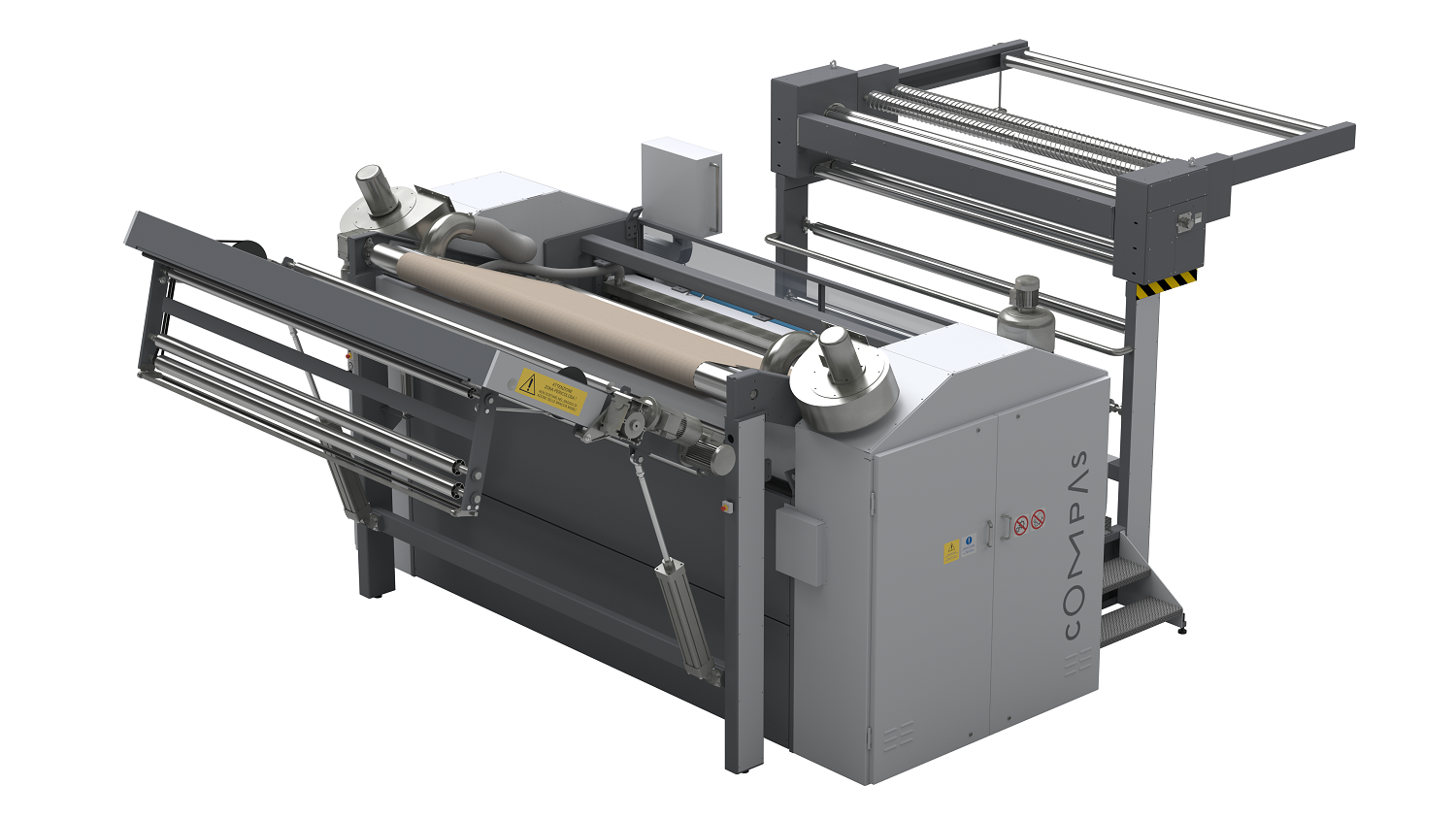 Another feature enables a minimal environmental footprint through technology-based process optimization. Chemicals used before the dry finishing process are typically softeners or resins to enhance the final appearance and touch of the fabric. These are then transferred to the final garment. It is possible to reduce significantly the level of such chemicals, since the machine partially compensates for the effect of these chemicals. Thanks to its unique compacting method, Compas imparts a silky touch, only partly attributable to the softeners used, while mainly deriving from the special materials in the machine design.