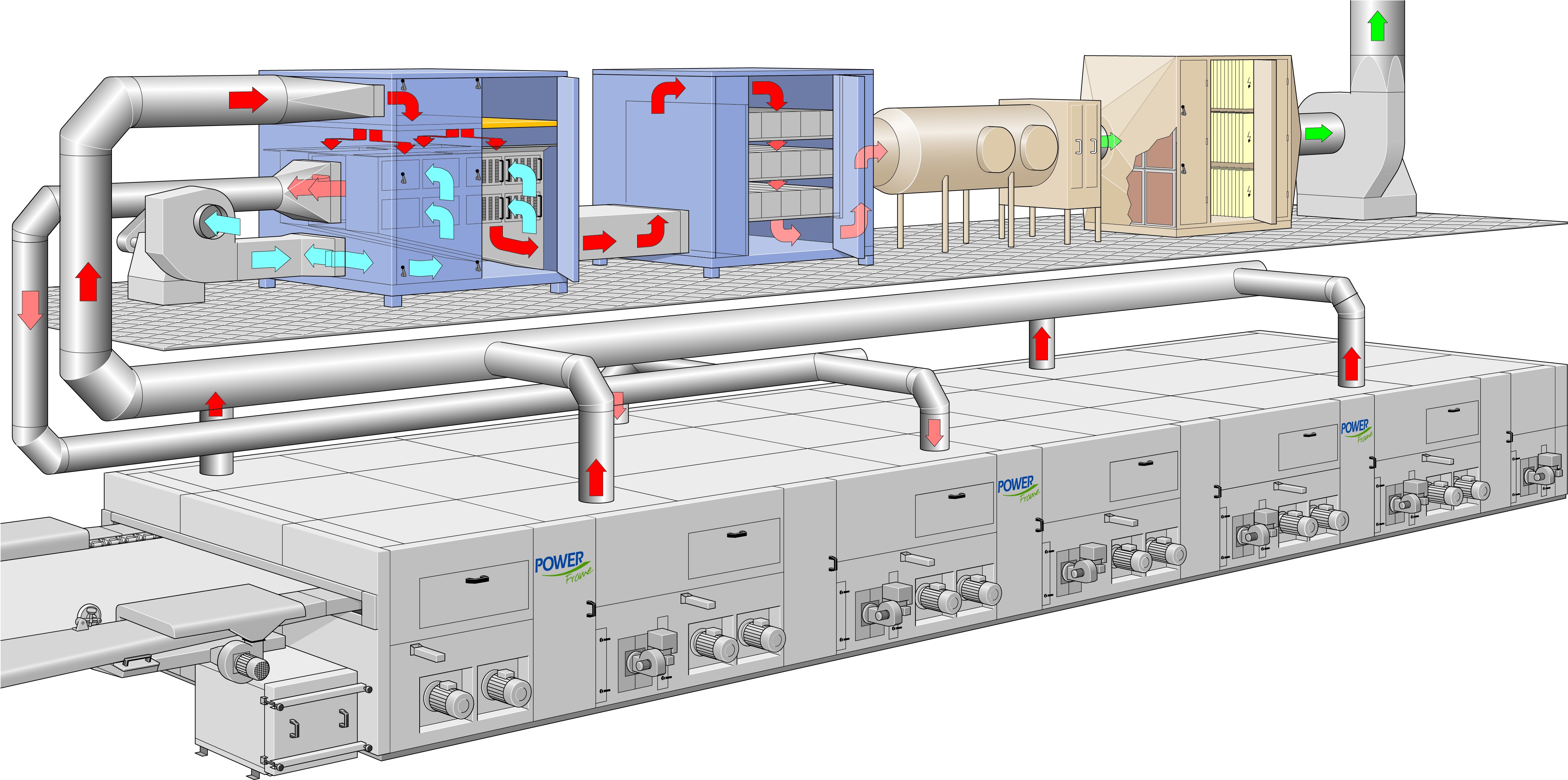 Full-stage heat-recovery and exhaust air purification system for greater energy efficiency and to reduce costs and emissions at drying lines