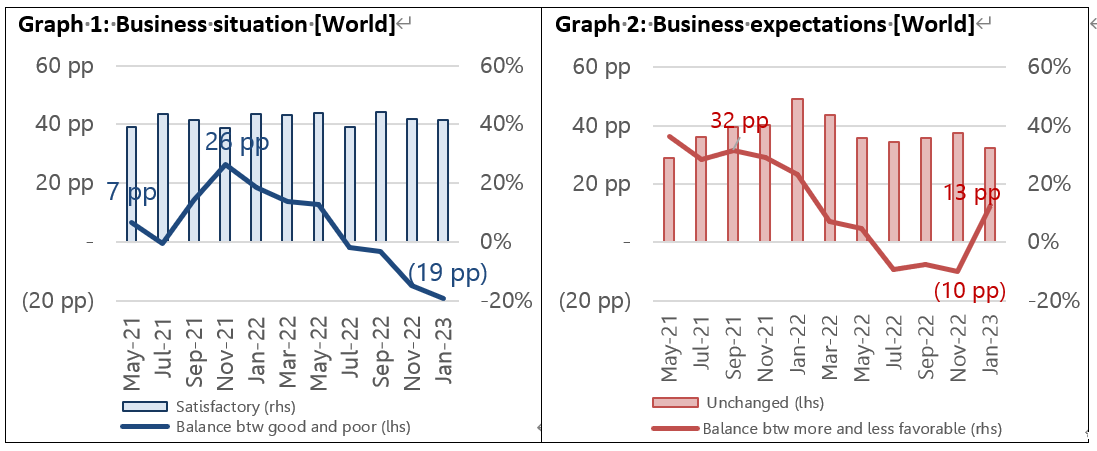 Expectations in 6 months-time have soared and respondents are globally positive about business in June 2023. Textile manufacturers expect a better situation due to two important factors. First, the world is now in a much better energy situation with a relative mild winter in Europe and energy prices in Europe and Asia (especially for gas) dropping back to levels seen before Russia’s invasion of Ukraine. Second, the sudden end of the Zero-Covid-policy in China with a swift opening of the borders is promising to strengthen demand in China as well as abroad (more tourists and imports of goods). Everything else being equal, the global economy will see a higher growth level than expected and this will benefit the global textile industry.