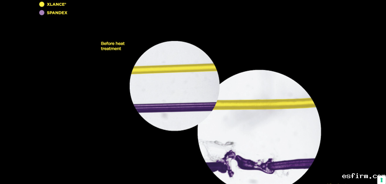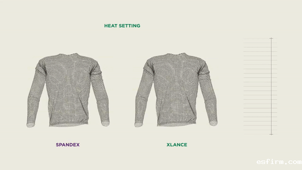 XLANCE® is heat set at 120°C, just above the crystal melting-temperature (against 185-190°C required for spandex). This is due to its molecular architecture and enables the combination with thermosensitive fibers, as well as guaranteeing significant energy and pollution savings.
