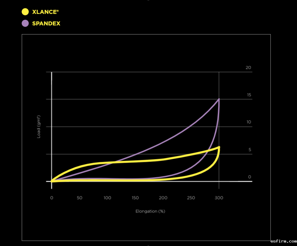 XLANCE® features an innovative gentle stretch power, completely different from the typical high stretch power of spandex. The force required to stretch XLANCE® is much lower than the one to be applied to spandex. This accounts for the unique comfort stretch feeling of XLANCE® shaping fabrics.
