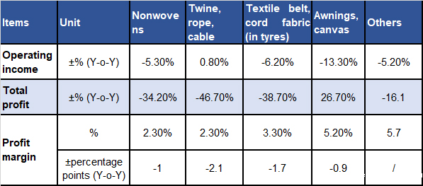 As for economic efficiency, technical textile enterprises above the designated size saw a decline of 6.1% in operating income and a decline of 28.5% in total profits, 0.5 and 1.2 percentage points narrower than that of the first three quarters respectively. Additionally, the operating profit margin is at 3.5%, 0.1 percentage points higher than that of the first nine months.