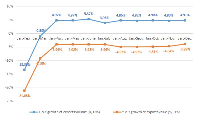 According to the statistics released by China General Customs, the export volume of eight major categories of printed and dyed products, i.e., dyed cotton fabric, printed cotton fabric, dyed cotton-blended fabric, printed cotton-blended fabric, synthetic filament fabric, polyester staple fabric, printed and dyed T/C fabric, man-made staple fabric, totaled 31.18 billion meters in 2023, up by 4.91% year-on-year, 0.09 percentage points higher than that of the first three quarters of 2023. While the export value reached US$ 30.12 billion, seeing a year-on-year decline of 3.89%, 1.03 percentage points narrower than that of the first three quarters. And the average export unit price was US$ 0.97/meter, declining by 8.39% year-on-year.