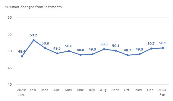 In January, the raw material purchasing index came in at 52.9%, up 4.2 percentage points over December 2023; the raw material inventory index came in at 52.5%, up 4.2 percentage points month-on-month; the production index was 50.9%, down 0.4 percentage points from December last year; the product sales index came in at 50.9%, down 0.4 percentage points from the previous month; the product inventory index was 49.7%, down 2.8 from December 2023 and the business index came in at 49.8%, down 2 percentage points from the previous month.