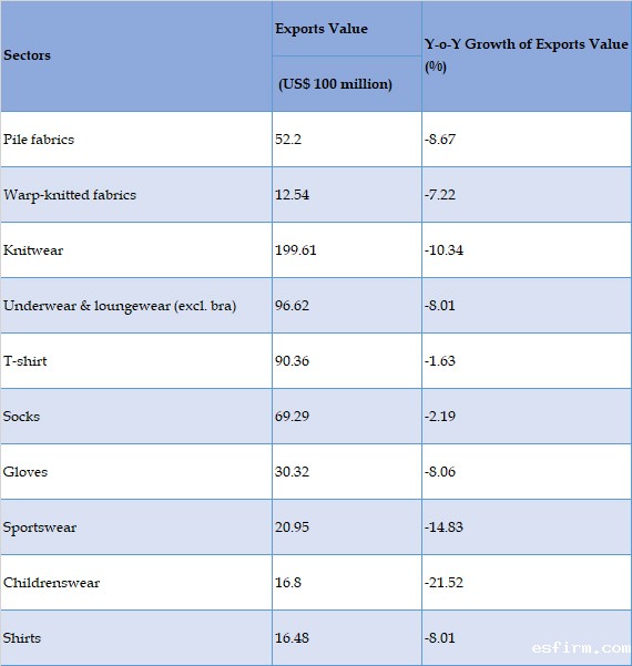 From the subcategory perspective, the decline in exports of T-shirts, socks, and other products was smaller last year. Relevant details are as follows: