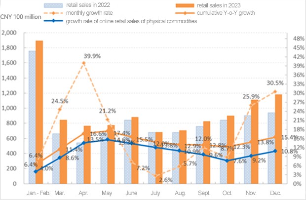 According to the National Bureau of Statistics, the total retail sales of consumer goods amounted to CNY 1.03 trillion, up by 15.4% year-on-year. In the fourth quarter, driven by the Singles Day shopping carnival, the seasonal sales of autumn and winter clothes, and the low base effect, the growth rate of retail sales of apparel above designated size reached 25.9% and 30.5% in November and December of 2023. The annual growth rate of retail sales of apparel and online retail sales of wearing goods accelerated by 2.6 and 1.2 percentage points respectively compared with the first three quarters last year.