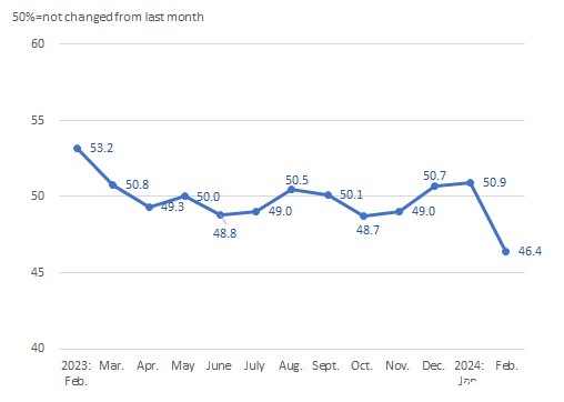 In February, the raw material purchasing index came in at 48.0%, down 4.9 percentage points over January; the raw material inventory index came in at 48.1%, declining 4.4 percentage points month-on-month; the production index was 45.0%, down 4.9 percentage points from January; the product sales index came in at 47.5%, down 3.2 percentage points from the previous month; the product inventory index was 48.0%, down 1.7 from January and the business index came in at 44.2%, decreasing 5.6 percentage points from the previous month.