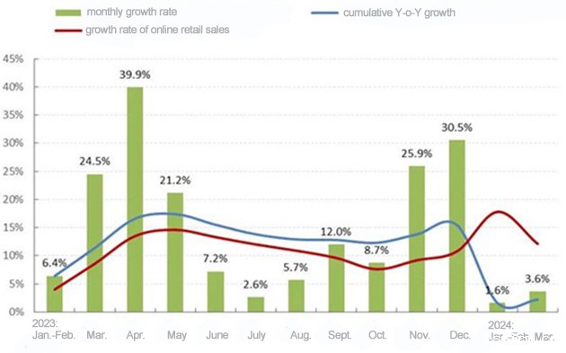 Thereinto, the retail sales of clothing by major retailers above the designated size up by 3.6%, 2 percentage points faster than the first two months. New forms of e-commerce, like live streaming and instant retailing, have greatly contributed to the growth of online shopping. The total online sales of wearable items increased by 12.1% year-on-year in the January-March period, marking a rise of 1.3 percentage points compared to 2023.