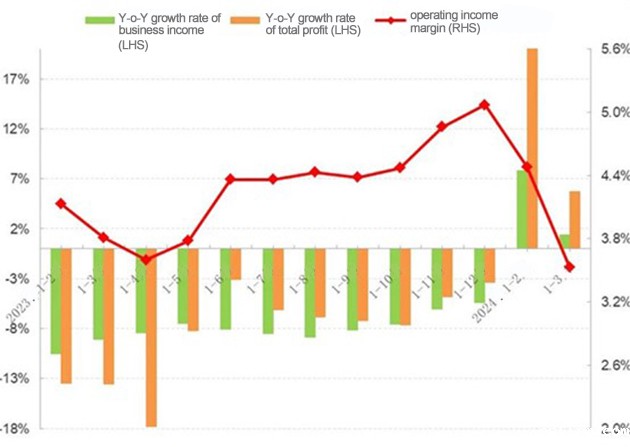 According to the National Bureau of Statistics, from January to March, the main business income of apparel enterprises above the designated size totaled about 269.76 billion yuan, with a year-on-year growth of 1.37%; the total profit was 9.52 billion yuan, up by 5.69% year-on-year. The margin of operating was 3.53%, 1.54 percentage points lower than the performance of 2023. 33.13% of apparel enterprises operated in deficit, which decreased by 0.18 percentage points year-on-year.