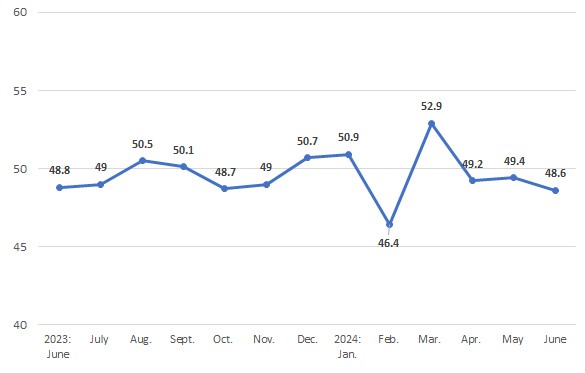 In June, the raw material purchasing index came in at 48.6%, down 0.7 percentage points over May; the raw material inventory index came in at 49.1%, down 1.7 percentage points month-on-month; the production index was 49.0%, down 1.2 percentage points compared with May; the product sales index came in at 48.5%, up 0.4 percentage points from May; the product inventory index was 48.4%, up 0.4 percentage points from May and the business index came in at 49.4%, down 0.5 percentage points from the previous month.