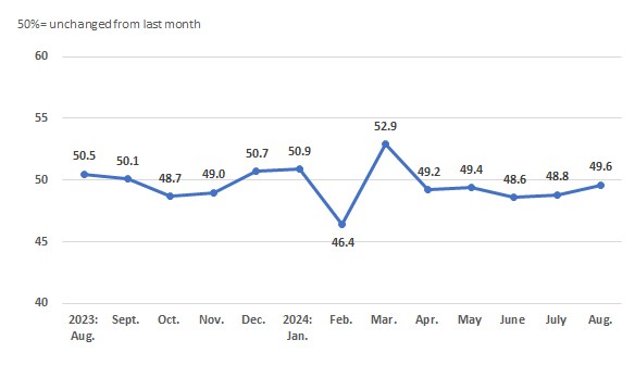 In August, the raw material purchasing index was 48.5%, unchanged from July; the raw material inventory index was 49.9%, up 0.7 percentage points month-on-month; the production index was 50.3%, up 1.0 from July; the product sales index was 49.8%, increasing 1.1 percentage points from July; the product inventory index was 48.7%, up 0.5 from July; and the business index was 49.1%, unchanged from July.