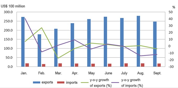 In September, the textile and apparel trade volume totaled US$ 26.52 billion, down by 4.4% year-on-year, of which exports were US$ 24.78 billion, down by 3.8%, and imports were US$ 1.75 billion, declining by 12.2%.