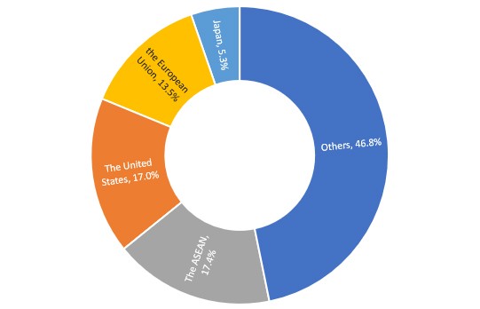 In September, among the four traditional markets, i.e., ASEAN, the United States, the European Union, and Japan, China’s exports to the United States and the European Union increased by 8% and 0.1%, respectively, to ASEAN and Japan fell by 4.8% and 18.5%. Total exports to the four traditional markets reached US$ 12.95 billion, accounting for 52.3% of the total exports in September. Affected by the high base of the same period last year and the difficulty of Russia’s export settlement and other factors, China’s exports to Russia and Kazakhstan appeared to be a substantial pullback in September.