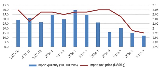 Figure 3: Monthly Cotton Import Volume and Price Trends from October 2023 to September 2024
