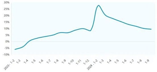 According to the National Bureau of Statistics, the chemical fiber output totaled 58.6 million tons in the first three quarters of 2024, seeing a year-on-year growth of 9.53% (Figure 1).