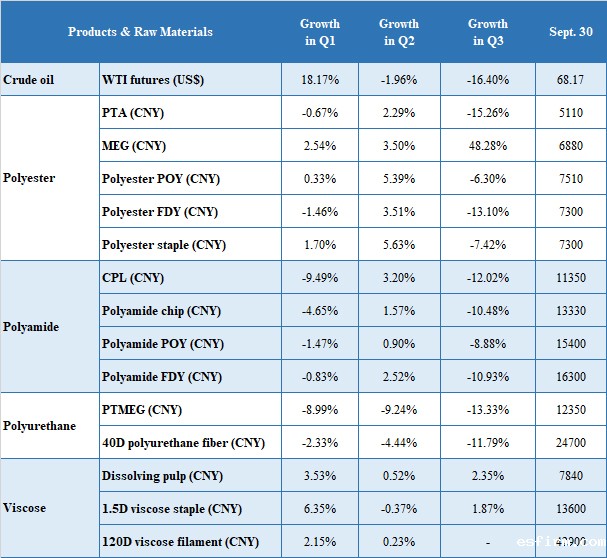 By sub-industry, polyester-related and polyamide-related raw materials fell obviously in the third quarter; polyurethane-related raw materials were in a downward trend; viscose fiber industry chain performed better, showing a slight upward trend (Table 1).