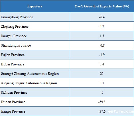 As for the exporting provinces, the main concentration area of China's apparel exports remained the eastern region; the central and western regions showed varied performance, of which the growth rate of apparel exports in Xinjiang slowed down significantly.