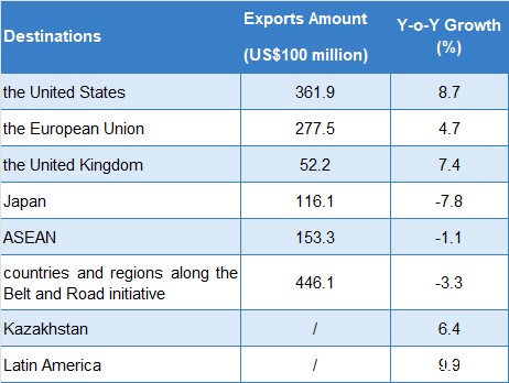 From the point of view of the major market, the apparel export market diversified. Benefiting from the better-than-expected economic growth in developed countries and the overall improvement in consumption, the international market demand has recovered. China’s apparel exports to the United States, the European Union and the United Kingdom grew, and the decline of that to Japan narrowed. During the same period, due to limited market space, coupled with last year’s high base factors, China’s exports to ASEAN, countries and regions along the Belt and Road initiative turned to negative growth, but the performance of exports to Kazakhstan and Latin America was brighter.