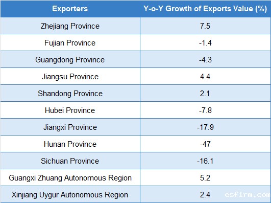 From the point of view of export provinces, the eastern region is still the major player in China’s apparel exports. The provinces in the central and western regions showed varied export performance; only Xinjiang Uygur Autonomous Region and Guangxi Zhuang Autonomous Region saw growth in exports.