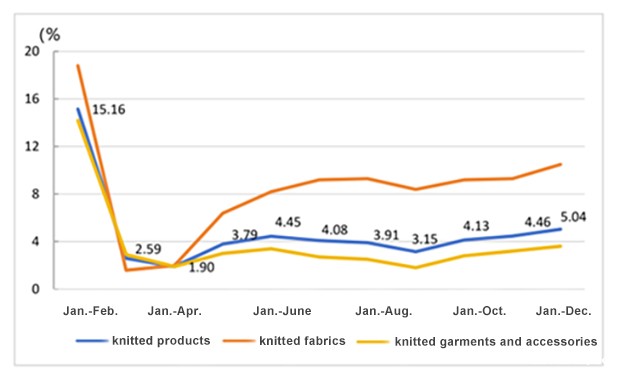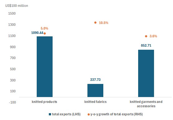 From the cumulative growth rate, knitted fabrics and apparel exports have grown yearly, performing better than the whole industry.