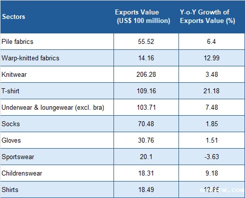 Among them, exports of T-shirts, warp-knitted fabrics, and shirts maintained double-digit growth.