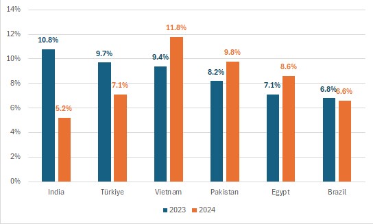 According to China Customs data, the exports of major chemical fiber products totaled 6.65 million tons in 2024, growing by 2.16% year over year (Table 2). By destination, India’s export volume experienced a significant reduction. In October 2023, India implemented BIS certification on polyester filament. Therefore, Chinese enterprises were urged to export, resulting in a sharp increase in polyester filament exports in 2023. While the exports last year did not continue the previous year's high-growth trend, the annual export volume decreased by 2.50% year-on-year. But when excluding India, exports of polyester filament to other countries and regions are actually growing. In addition, the chemical fiber export market share changes significantly (Figure 1). India and Türkiye’s share fell by 5.6 and 2.6 percentage points, respectively, while Vietnam, Pakistan, and Egypt’s share increased significantly.