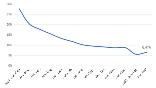 In the first quarter, the overall production of the chemical fiber industry was strong, though the starting loads for subsectors varied. Among them, the starting load for direct spinning polyester filament increased each month, averaging 85% in January, rising to 89% in February, and reaching 94% in March. The nylon civil filament maintained an average starting load of 82% for the first quarter, which was essentially the same as in 2024. In contrast, the spandex average starting load was 79%, marking a decline of 2.8 percentage points from the same period in 2024. Since April, the trade conflict between China and the U.S. has intensified, deepening the negative external impact. Influenced by the macroeconomic environment, the chemical fiber industry’s starting load has decreased. According to the National Bureau of Statistics, the chemical fiber output totaled 20.63 million tons in the first quarter of 2025, seeing a year-on-year growth of 6.47% (Figure 1).