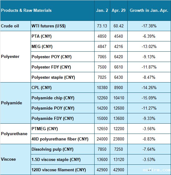 Table 1: Price Change of Main Chemical Fibers and Raw Materials Since the Beginning of 2025