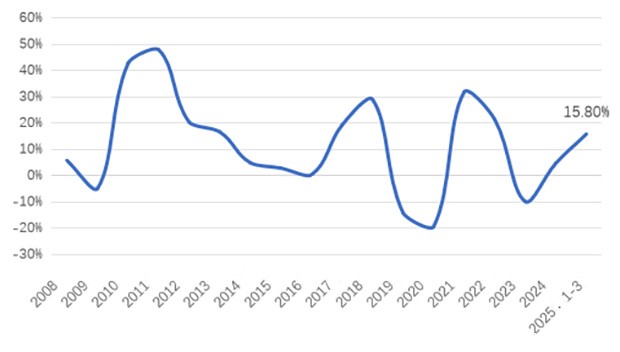 Figure 2: Fixed-Assets Investment Growth of the Chemical Fiber Industry from 2008 to Q1, 2025