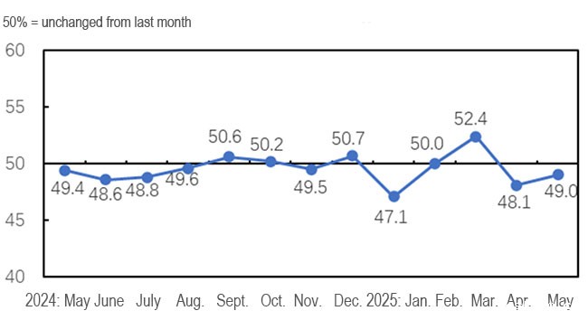 In May, the raw material purchasing index was 49.7%, 2.2 percentage points higher than in April; the raw material inventory index was 48.5%, down 1.4 percentage points month-on-month; the production index was 48.2%, up 0.2 percentage points from April; the product sales index was 48.9%, increasing 2.0 percentage points month-on-month; the product inventory index was 48.6%, down 0.5 percentage points from the previous month; and the business index was 49.4%, up 1.3 percentage points from April.