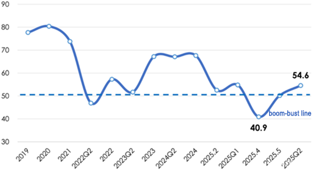 In the first half of 2025, the global economic recovery is weak, unilateralism and protectionism have intensified, and multilateralism along with free trade face severe challenges; meanwhile, domestic economic operations in China remain generally stable and strong, demonstrating resilience and vitality amid a complex and volatile environment both at home and abroad. China’s technical textiles industry successfully overcame the impact of multiple unfavorable factors domestically and internationally, maintaining a stable and growing trend. According to the research of China Nonwovens & Industrial Textiles Association (CNITA), the prosperity index of China’s technical textiles industry in the first half of 2025 was 54.6, within the micro-prosperity zone (Figure 1).