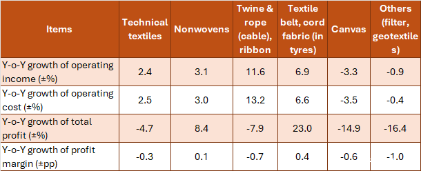 In the first half of 2025, the economic benefits across different sectors of China’s technical textiles industry showed mixed trends. After the COVID-19 pandemic, nonwoven capacity grew quickly, while demand for medical and hygiene textiles dropped, putting more adjustment pressures on the industry. The price of finished goods mainly influenced industry profits, but decreases in raw material prices also helped lessen profitability pressures somewhat.