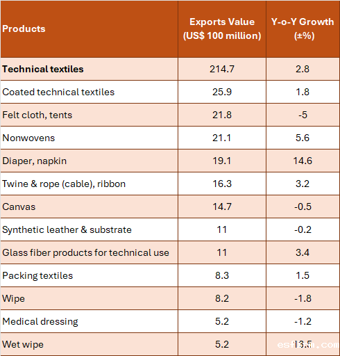 According to China Customs data, the export value of China’s technical textiles industry (customs 8-digit HS code statistics) from January to June 2025 totaled US$21.47 billion, seeing an increase of 2.8% year-on-year; the imports reached US$2.67 billion, up 4.1% year-on-year (Table 2).